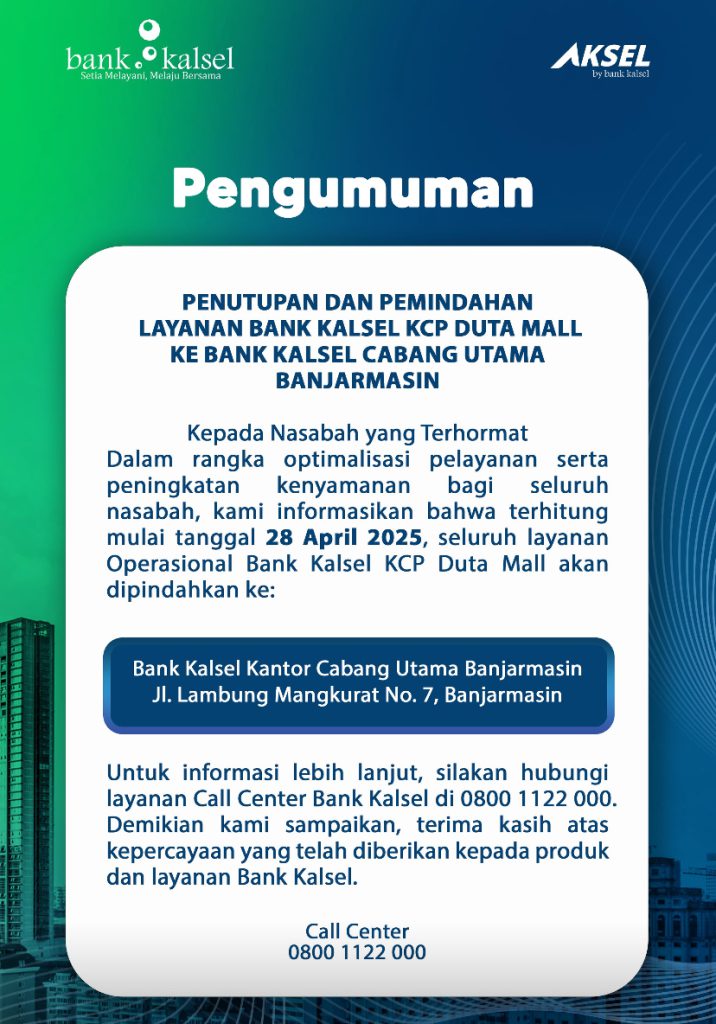 Pemindahan layanan ini merupakan salah satu upaya Bank Kalsel untuk meningkatkan kualitas pelayanan dan memberikan pengalaman perbankan yang lebih baik bagi nasabahnya. Bank Kalsel berharap dapat menjadi pilihan utama bagi masyarakat Kalimantan Selatan dalam melakukan transaksi perbankan. (HNG/JID).